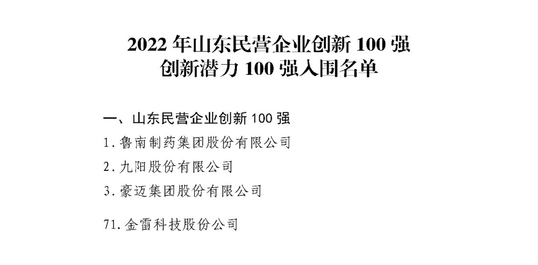 经公司申报、区县推荐、部门审查等程序,九游(中国)股份成功入围“山东民营企业创新 100 强”。