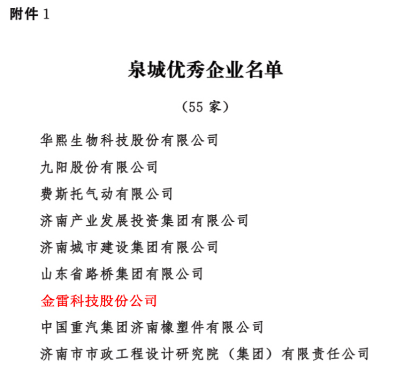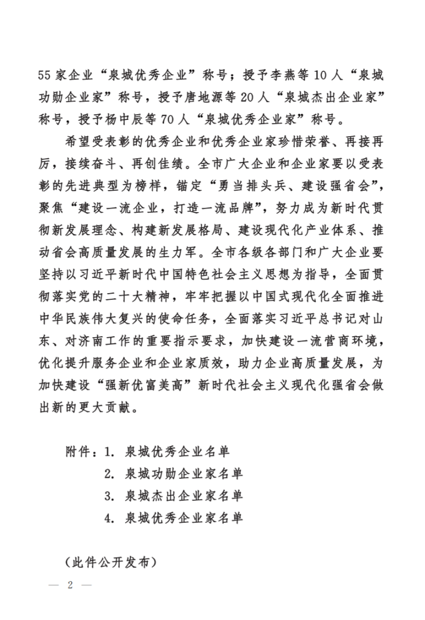 2023年7月6日,中共济南市委、济南市人民政府颁布《关于表彰济南市优秀企业和优秀企业家的决定》,我司被授予“泉城优秀企业”称号,这是对我司多年来锐意进取、担当实干、勇于创新、奋力拼搏的认可。